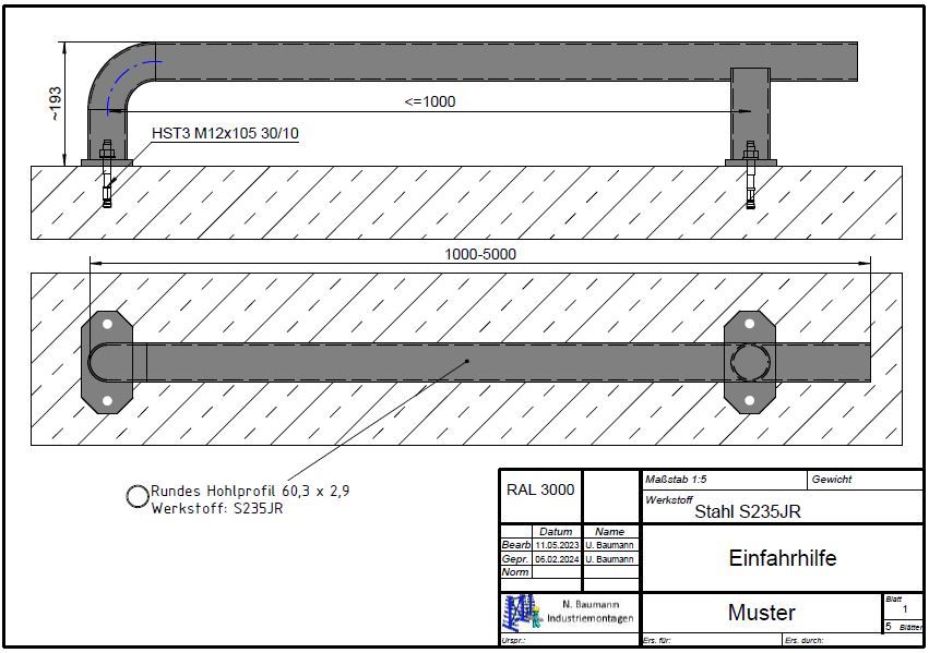 lt. Zeichnung: Einfahrhilfe bestehend aus: Gesamtlänge: 5000 mm Gesamthöhe: 190 mm Geschw.Stahlrohr 60,3X2,9 mm, S235 Ankerplatte 150x100x8 mm, S235 Siederohrbogen 60,3 X 2,9 mm 120 STK 3,25 E 390,00 19 Norm 3 S; 90 Grad; DIN 2605 RAL 3000 Maße können etwas abweichen.